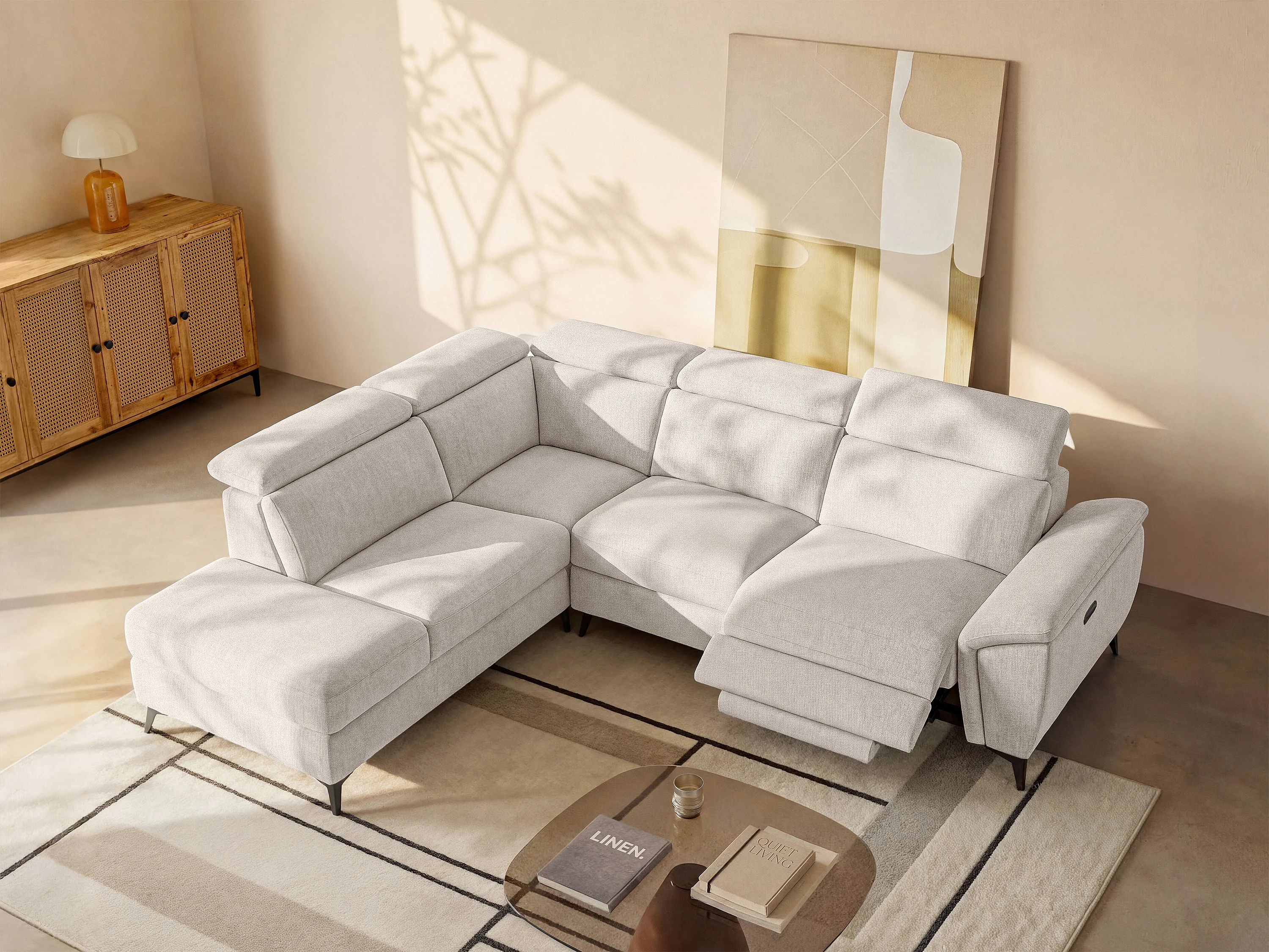 Vänstervändvänd elektrisk hörnsoffa med melerad beige tygklädsel CADILO