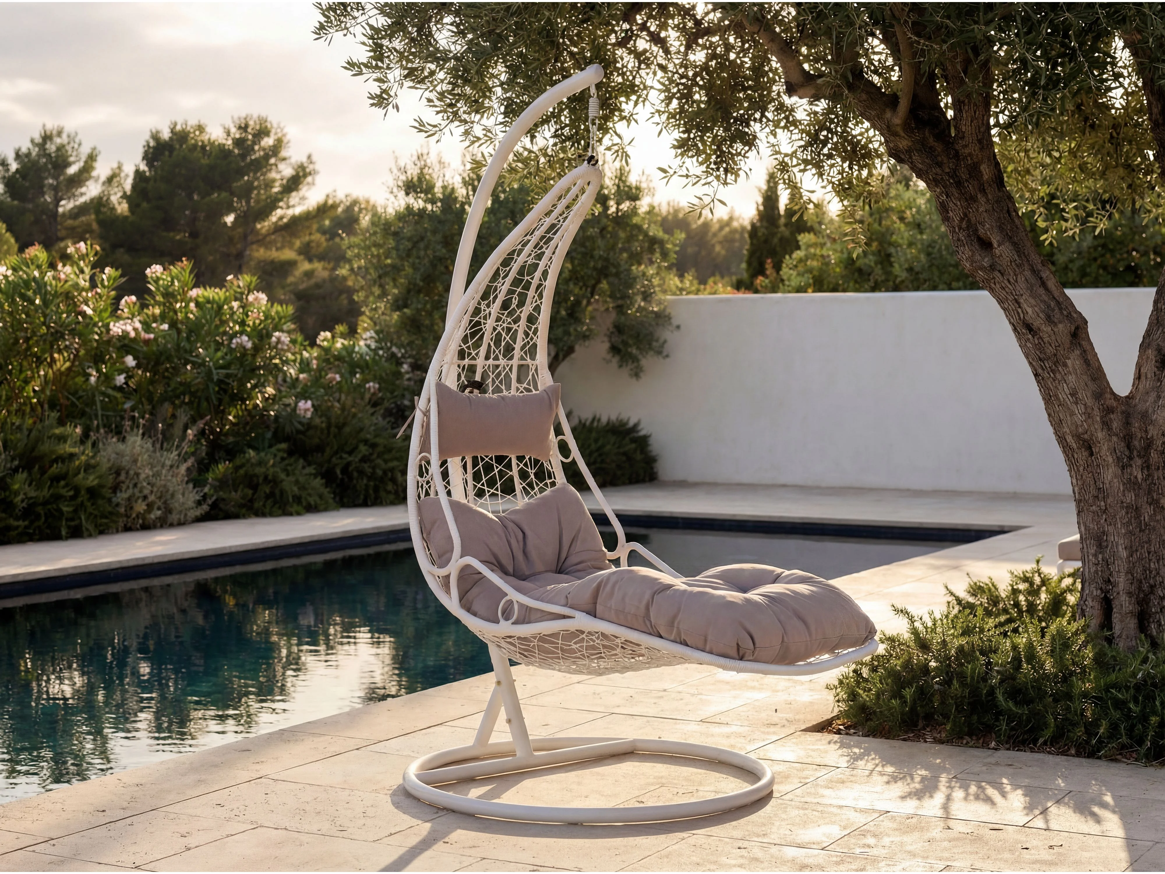 Hängfåtölj i flätad konstrotting - Vit med grå dynor - LUVA från MYLIA