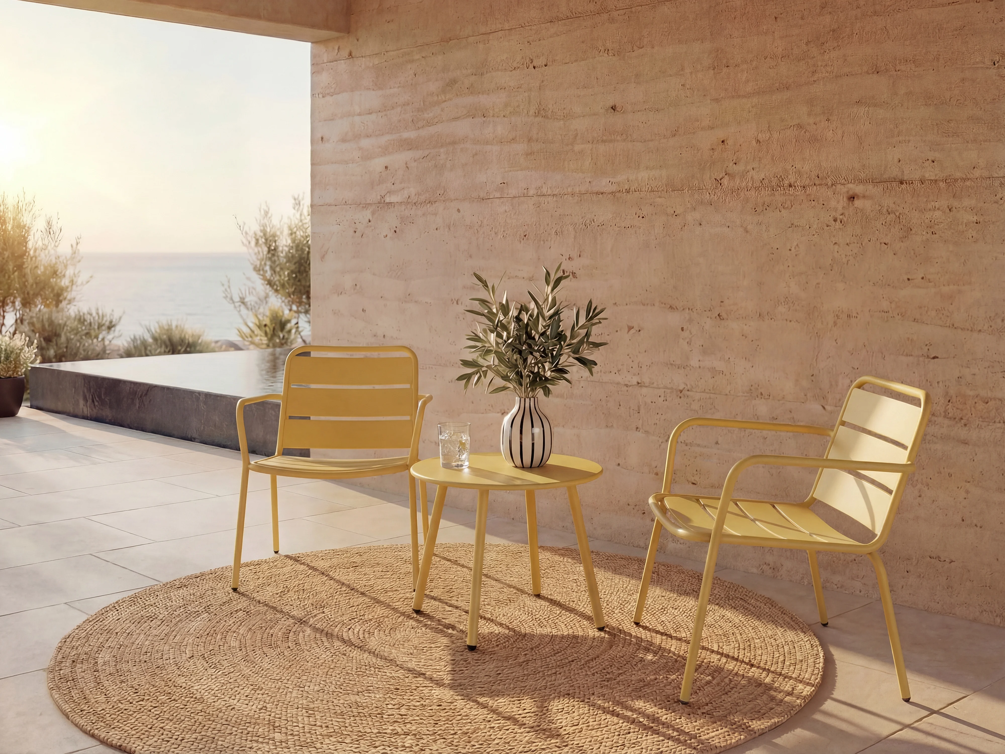 Trädgårdsmöbleset i metall - 2 stapelbara låga fåtöljer och ett runt sidobord - senapsgul - MIRMANDE från MYLIA