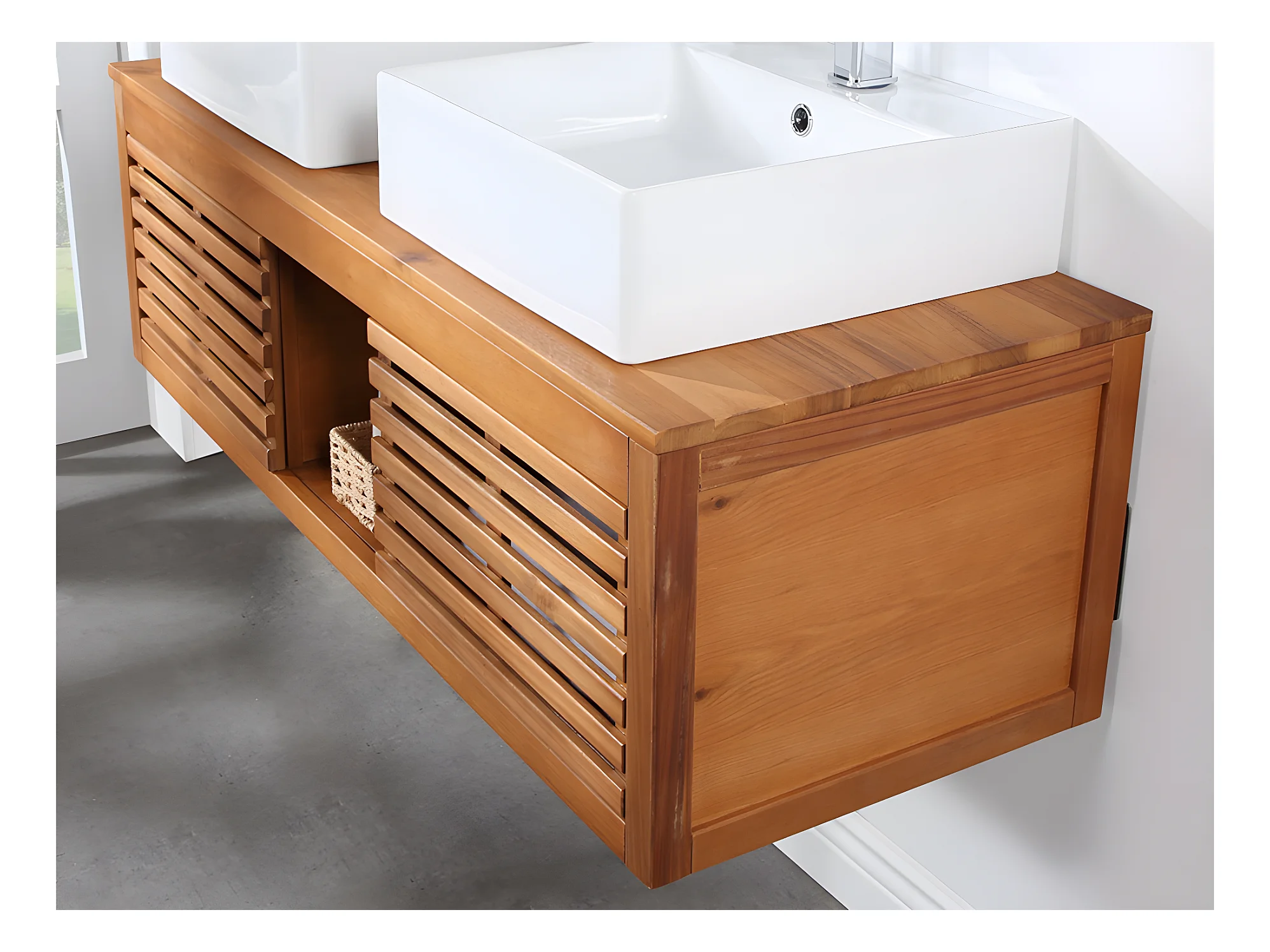 Väggmonterad badrumsmöbel i akaciaträ med dubbla handfat och speglar - 130 cm - PENEBEL