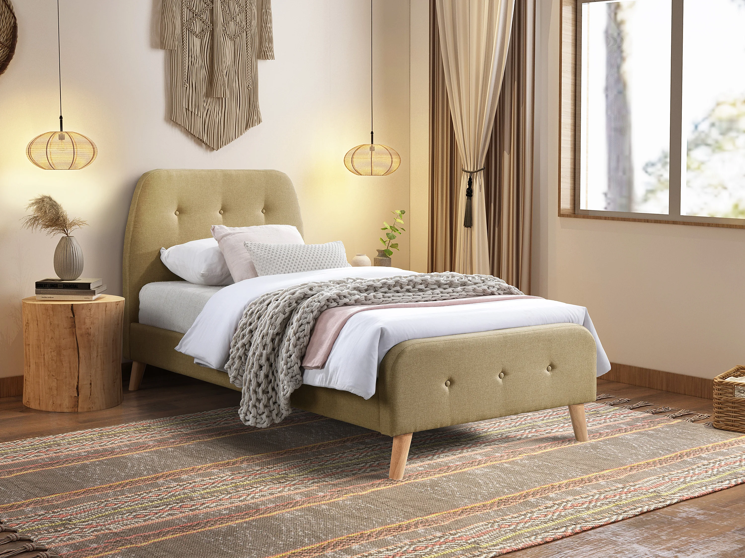 Säng 90 x 190 cm med stoppad sänggavel - Tyg - Beige - ROMEO